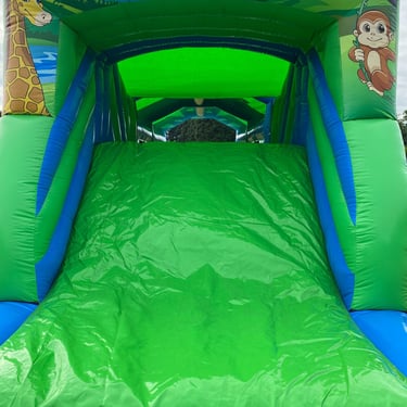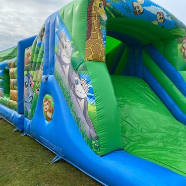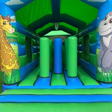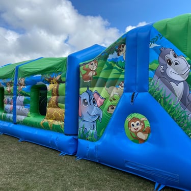 This Adult Suitable Jungle Themed Obstacle Course Bouncy Castle is perfect for all ages and guarantees a day of endless fun. Whether you're hosting a birthday party or any other special event, this massive inflatable castle will provide entertainment for the whole family. With its jungle theme, it creates an exciting atmosphere that transports you to a wild adventure. Jump, slide, and crawl through the various obstacles, testing your agility and strength. The vibrant colours and sturdy construction ensure a safe and enjoyable experience for everyone. So gather your friends and loved ones and bounce the day away in this thrilling jungle obstacle course bouncy castle!