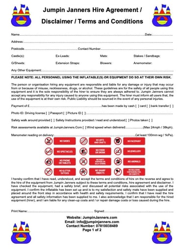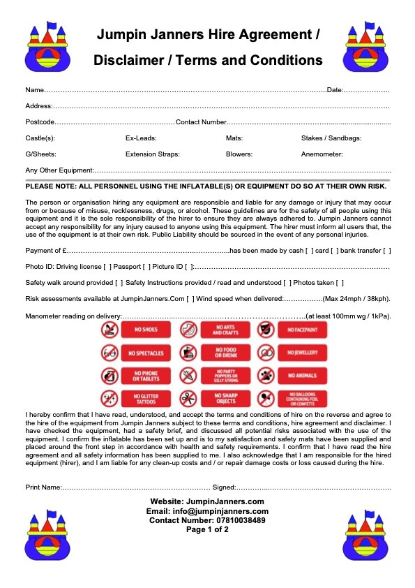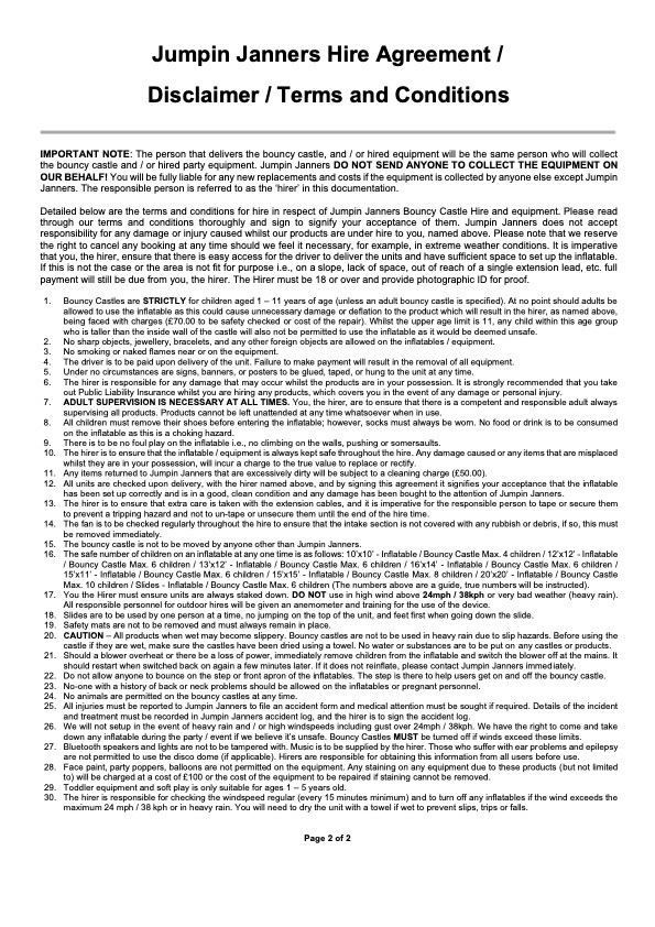 Upon delivery the hirer must sign our T&Cs / Disclaimer and Hire Agreement. The hirer will also need to pay any outstanding balance when accepting delivery of the equipment / products. Jumpin Janners will NOT deliver any equipment / products without the final balance paid either on delivery or prior to any event starting, in accordance with the above booking fees and charges.