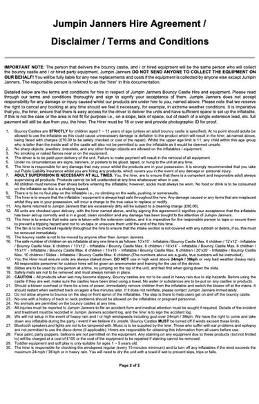 Jumpin Janners excludes any liability for injury, loss or damage caused to any person using the equipment contrary to our terms & conditions.
